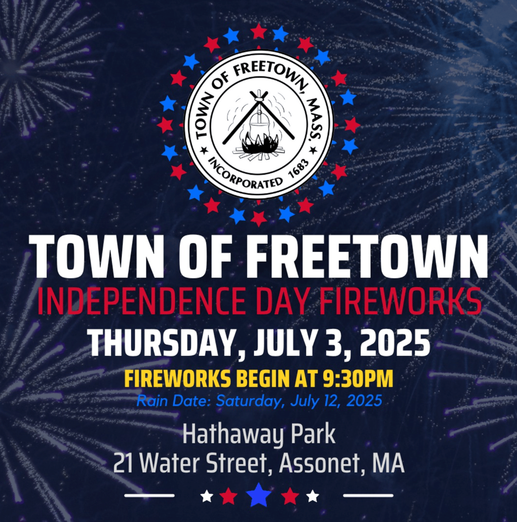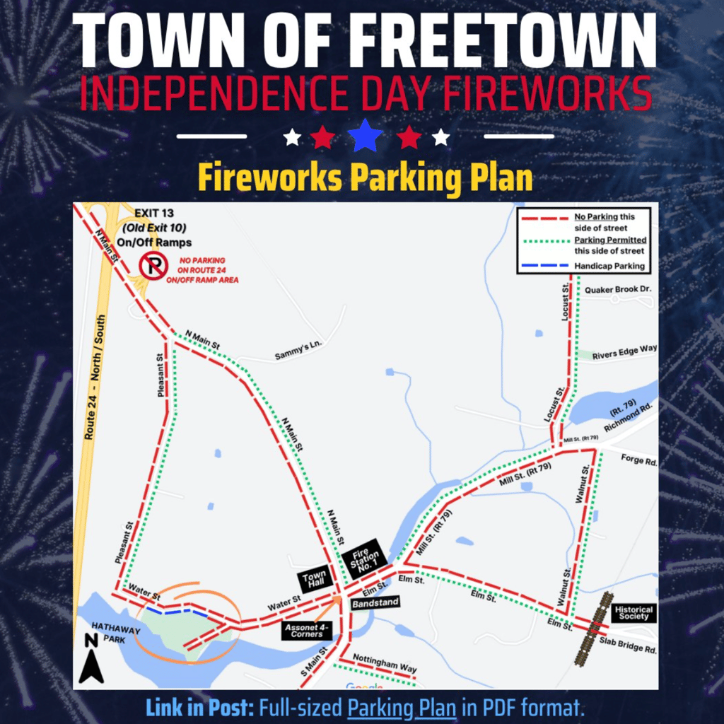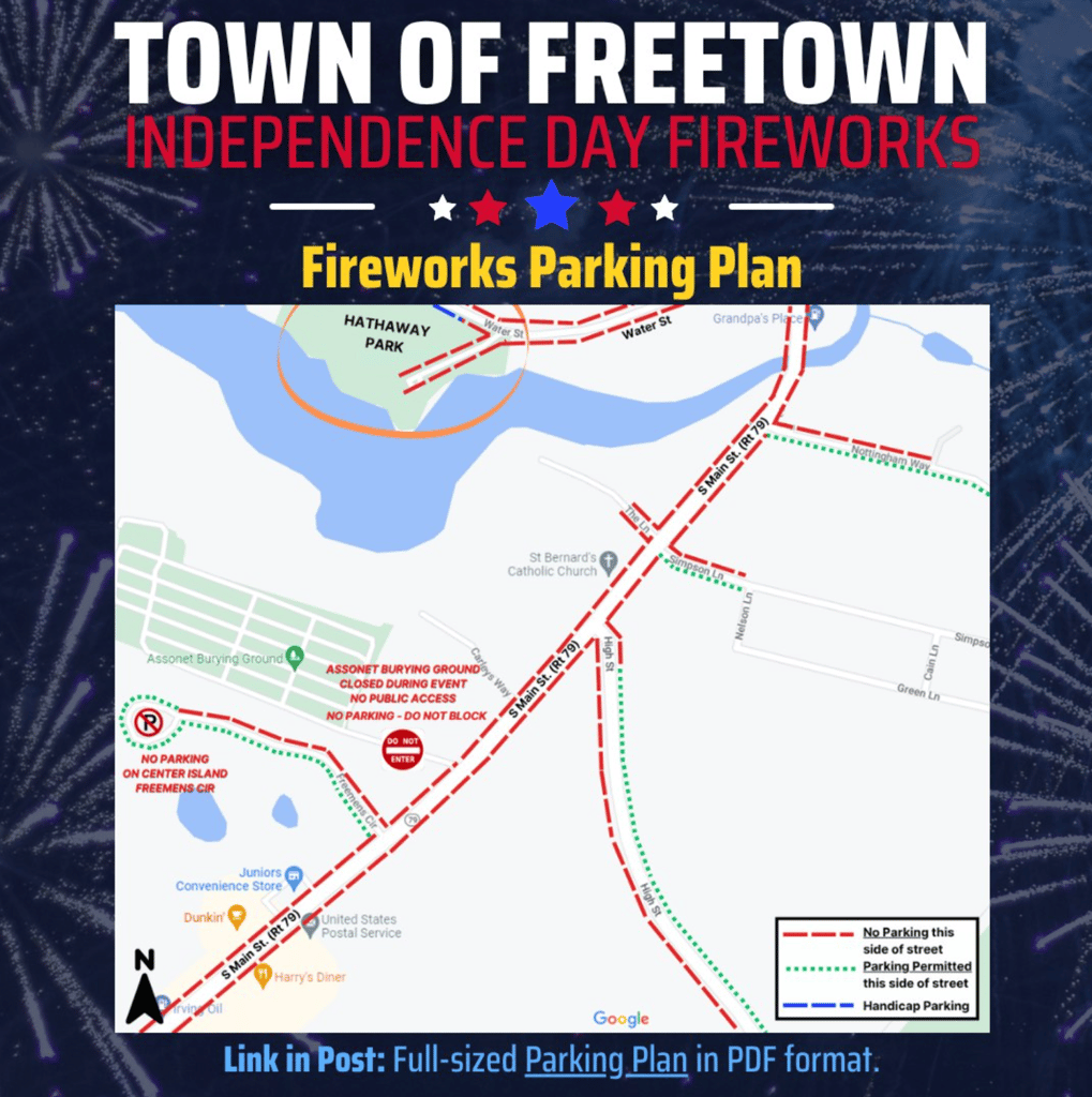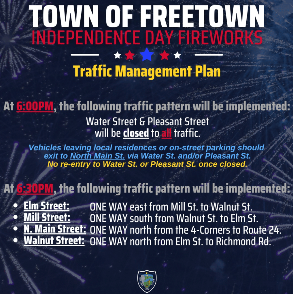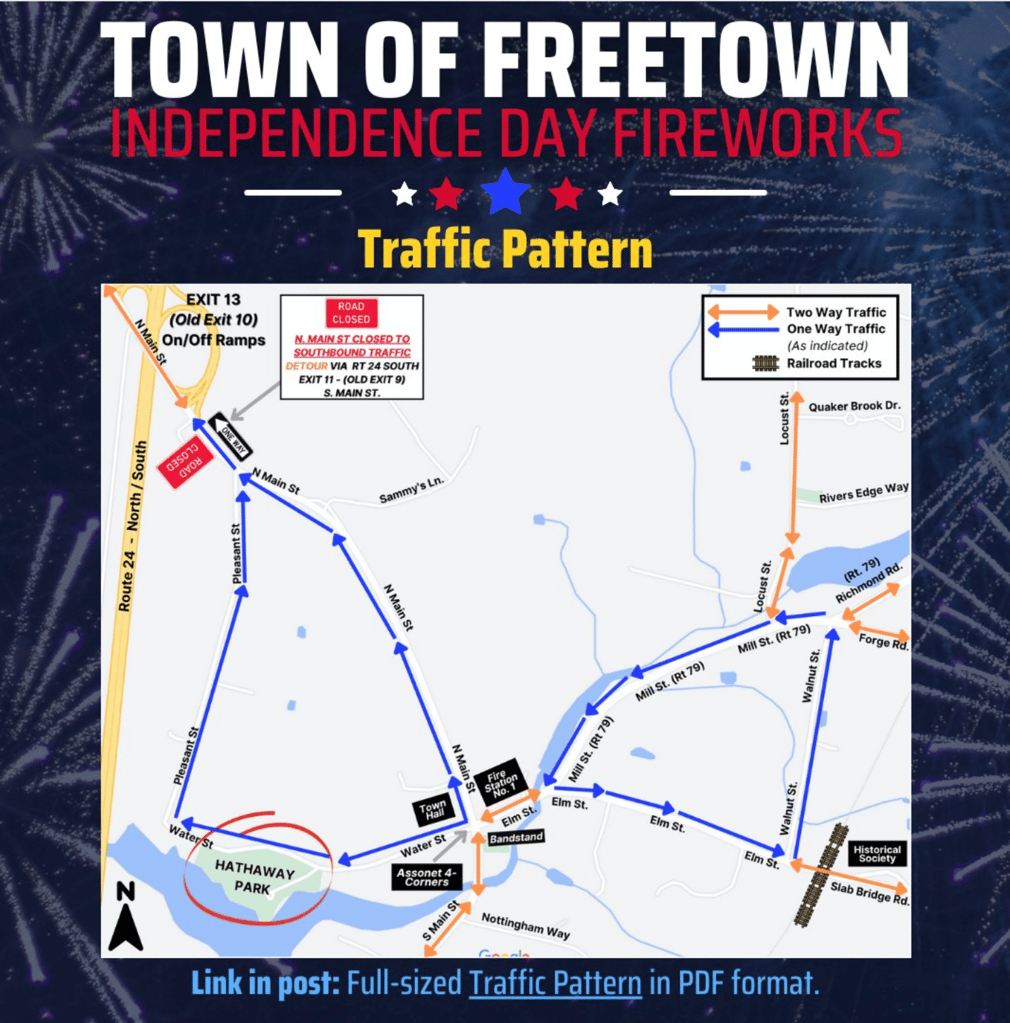 Join us Thursday, July 3rd for Freetown’s annual Independence Day Fireworks at Hathaway Park. Fireworks will begin at 9:30pm. Please see attached photos for traffic patterns. Expect heavy traffic in the area, plan ahead.
