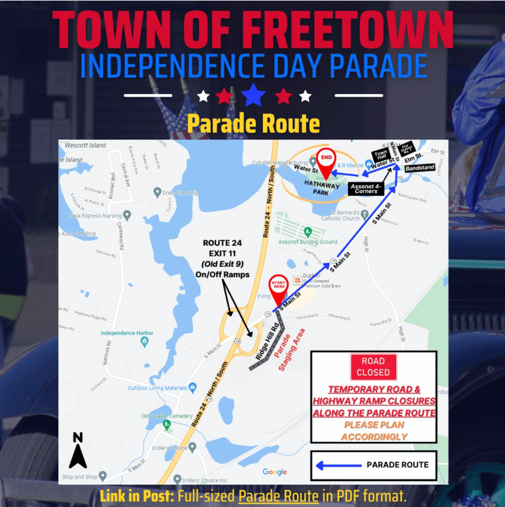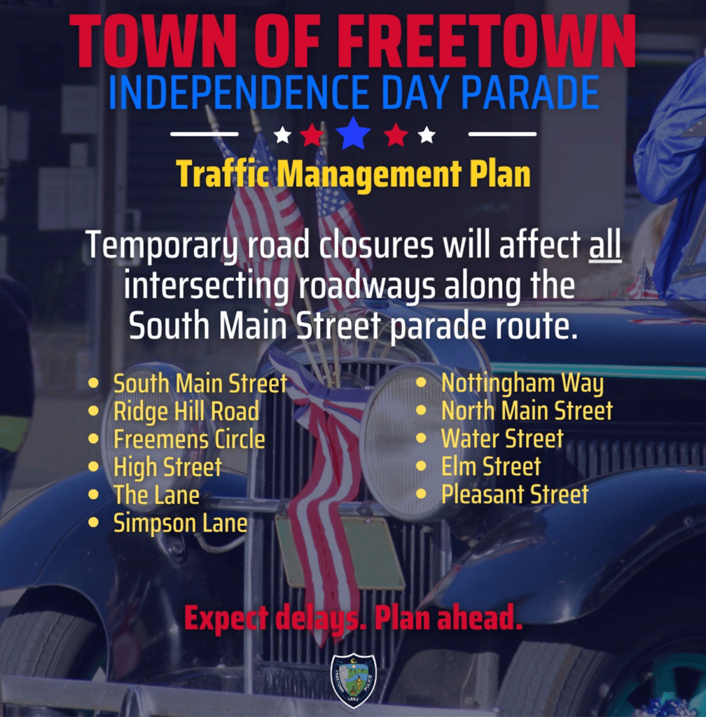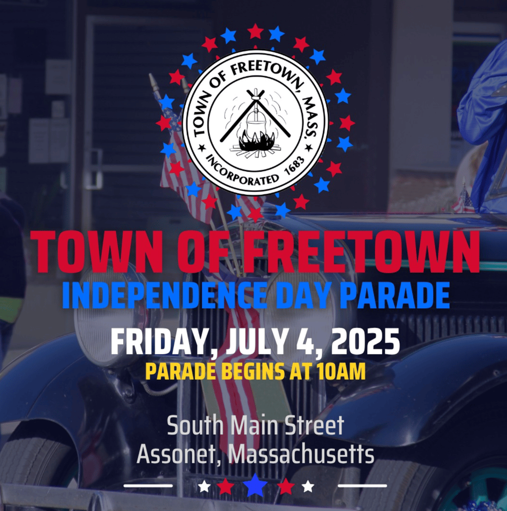 Join us Friday, July 4th, 2025 at 10am for Freetown’s Annual Independence Day Parade. The parade steps off from Ridge Hill Road, travels north on South Main Street, turns left onto Water Street, and ends at Hathaway Park — right through the heart of Assonet Village. Expect traffic delays, plan ahead.
