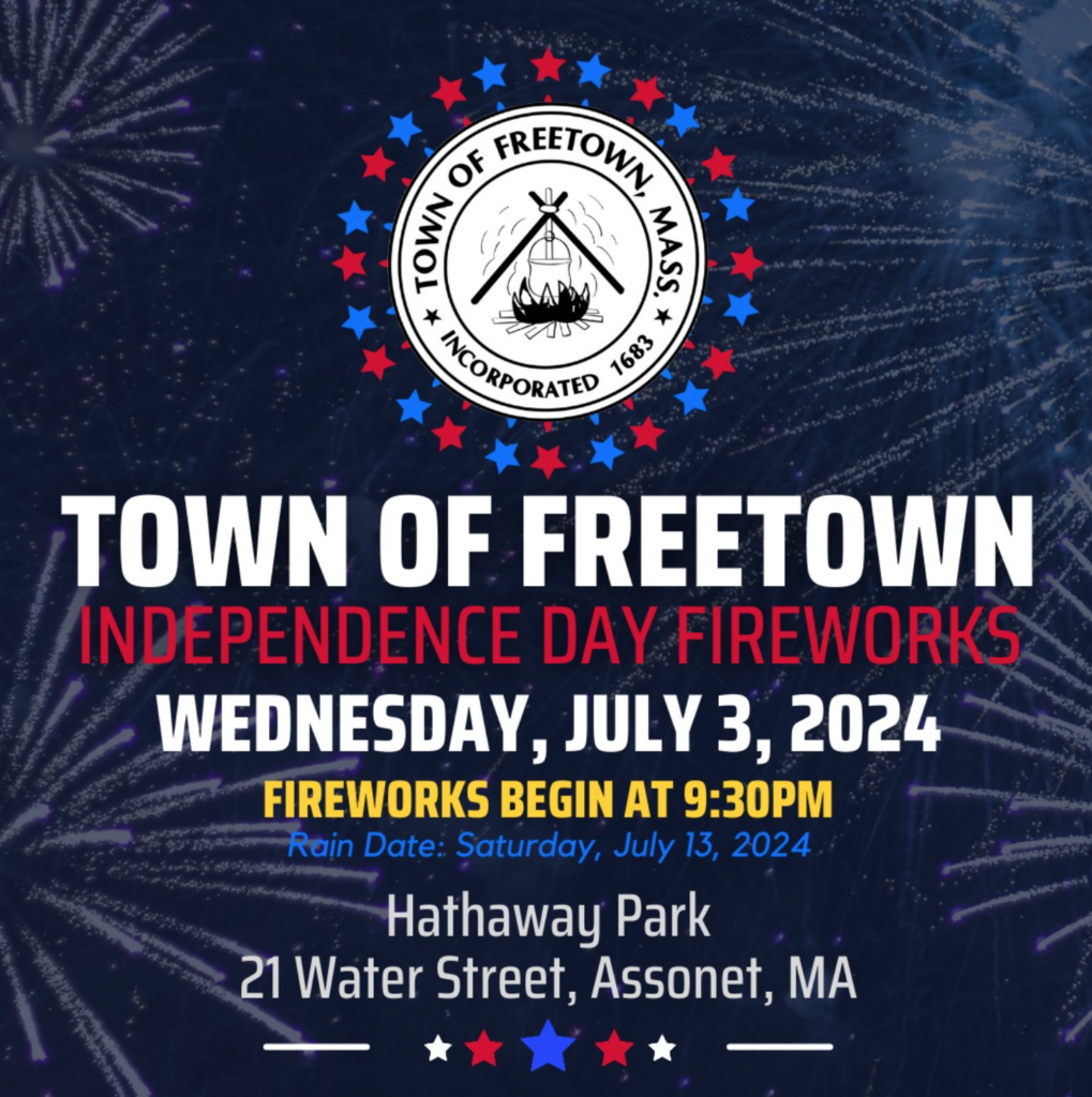 Wednesday, July 3rd, 2024 | 9:30pm | Hathaway Park Join us Wednesday, July 3rd for Freetown’s annual Independence Day Fireworks at Hathaway Park. Fireworks will…